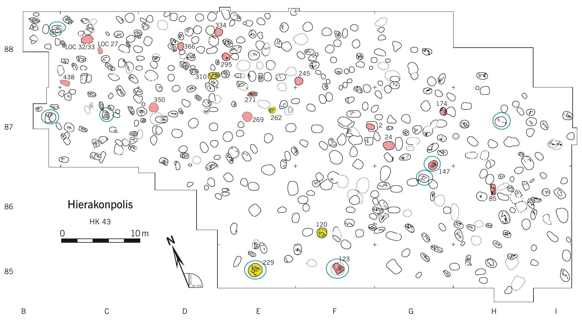 The cemetery called HK43, belonging to the non-elite (or workers) segment of the predynastic population, holds over 500 individuals of Naqada IIB-C period (roughly 3650-3500 BC). Excavations at HK43 have uncovered cutmarks found on the neck vertebrae of 21 individuals (from 15 graves and one disturbed cluster), indicating the cutting of the throat and in some cases, complete decapitation, five of whom (all young men) were also scalped. Of the 21 afected individuals, the majority that could be sexed were males (52 %, n = 11) and 9.5 % were females (n = 2), the rest being indeterminate. Most of the vertebral cut marks were located on the second, third, and fourth vertebrae and were inficted from the ventral aspect. However, none of the victims bore evidence of other violence or defensive wounds on their bodies. Furthermore, several individuals also suffered from fractured skulls, the result of severe blows to the head.
