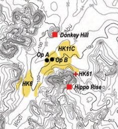 At HK29A, a monumental gateway framed by four enormous acacia wood pillars was found on the south side of a walled, oval courtyard.